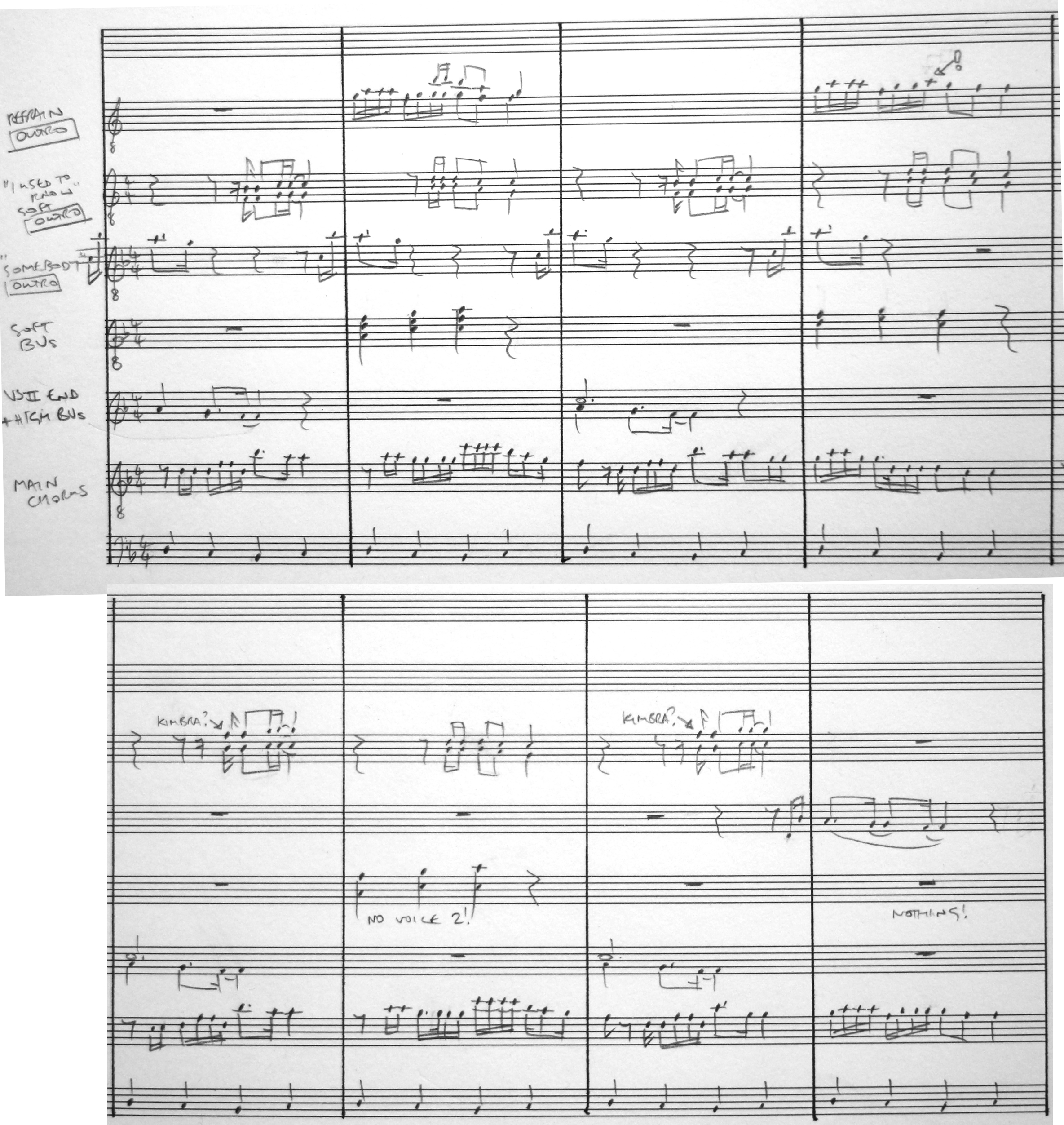 Finally, I mentioned that I’d transcribed the vocal arrangement of this song for the purposes of the critique. In case anyone wants to look at that transcription, here are some of my manuscript scrawls!